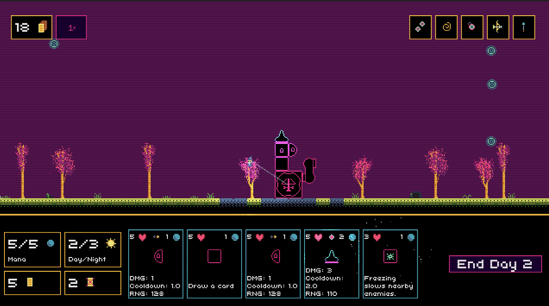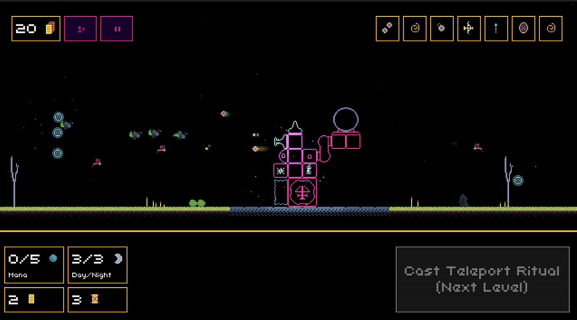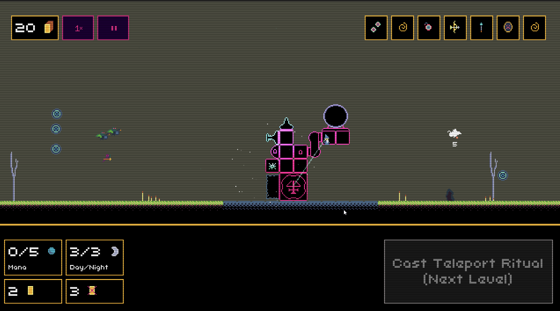 During the day, design your perfect wizard tower by casting spells that place traps, archer windows, bomb throwers, and spires that blast enemies with magic. Take advantage of devious synergies, like igniting arrows with a brazier, slowing enemies with a freezing aura to bunch them up, then blast them with bombs. Make your magic-missiles into bombs! Make your bombs make more bombs!