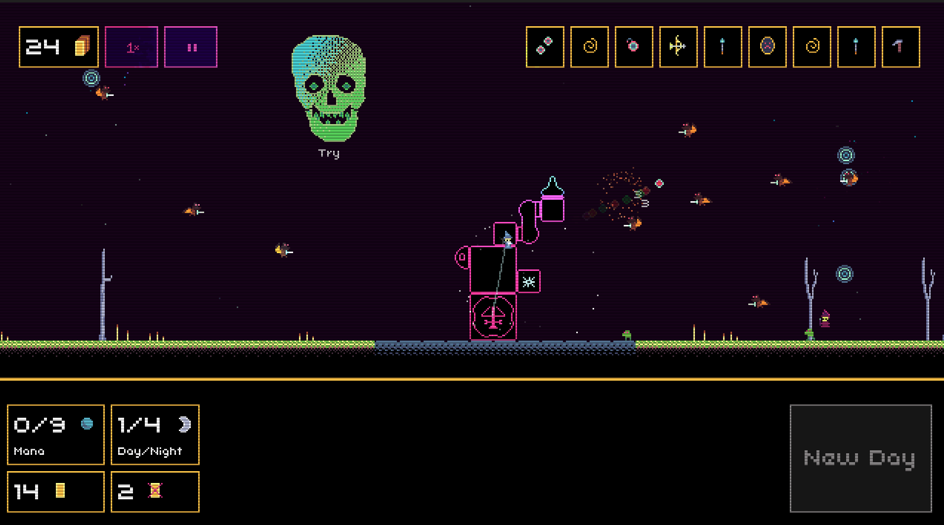 First win, on my fourth attempt! On the third, the skull sniped my tower right as it was around 10 hp and last enemy standing, on the final night lol. I really couldn't come up with any harsh feedback! All I ever noticed was that knockback stops working fast, because enemies collide on each other, and there are oftentimes more bomb relics than bomb cards to choose.